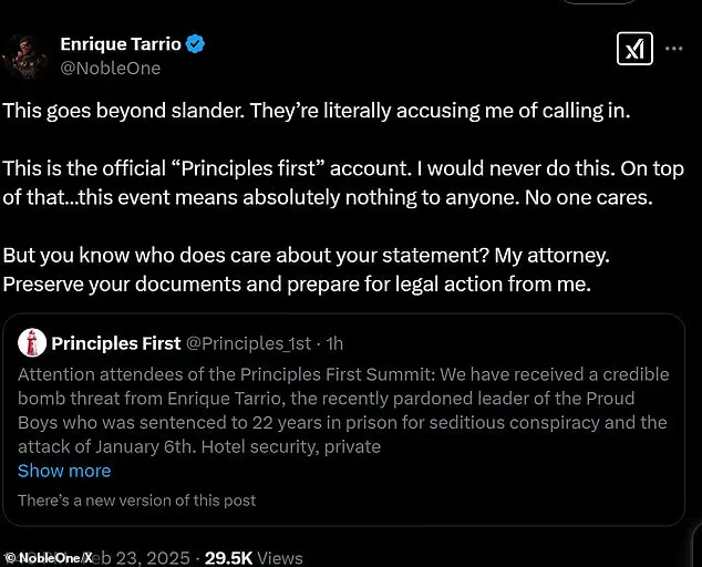 Enrique T.” This incident sparked a wave of excitement and concern among those present at the summit. Tarrio, who was recently released from prison after being pardoned by former President Trump, has strongly denied any involvement in the email threat.\n\n The email read, “Attention attendees of the Principles First Summit: We have received a credible bomb threat from an account claiming to be ‘Enrique T.’ ‘To honor the J6 hostages.'” This reference to the January 6th incident, when pro-Trump protesters stormed the U.S. Capitol, added a layer of tension to the already charged atmosphere at the summit.\n\n Tarrio’s presence at the gathering sparked controversy. Principles First accused him