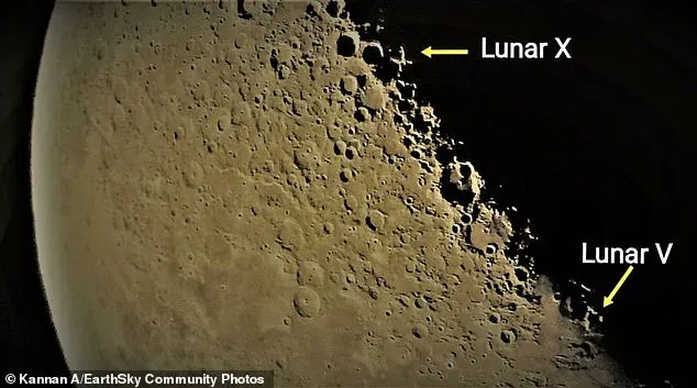 When the sun begins its descent toward the horizon on Thursday evening, it will illuminate a striking celestial phenomenon visible only under certain conditions: the Lunar X and V. These unique features form when sunlight hits specific craters on the Moon’s surface in just the right way, creating an optical illusion that transforms the lunar landscape into an almost geometric shape.