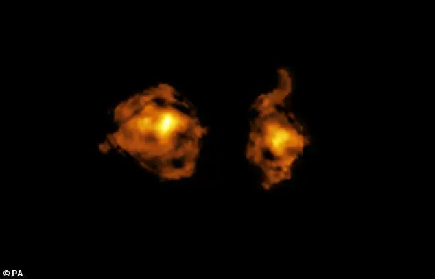 Co-lead author Dr Pasquier Noterdaeme, of the Institut d’Astrophysique de Paris, told MailOnline: ‘The super intense UV light from the quasar is able to disrupt molecular gas in the other galaxy.’ Using two extremely powerful telescopes, researchers have captured the moment these two galaxies collide.