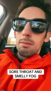‘Within about an hour, I kept sneezing over and over for about three hours, and my eyes were really puffy,’ said the resident. ‘I got very warm and I felt like I had a fever, and my stomach was cramping.’ Another TikTok user, who goes by ‘Rusky’, added that he has been experiencing symptoms such as sore throat, coughing, tiredness, and lethargy.