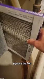 The idea about these particles has led some Americans to check their air filters, leading to a shocking discovery by a North Dakota resident who recently changed his filter. ‘Super dirty, so quickly,’ he said in a video, showing it next to a brand new filter to demonstrate how much residue had accumulated. The text of the video reads: ‘Beware the fog.’