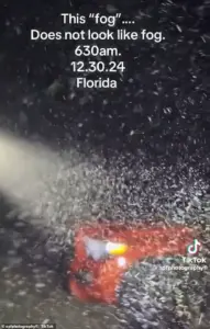 Florida resident Holly Meyer Lucas shared her experience in a TikTok video: ‘I’ve been sick and my eyes have been an absolute painful disaster for like two weeks now. We’ve had the fog in Florida, which is absolutely not normal.’ The reports claim that the fog is unusual due to its smell and appearance as white particles swirling in the air.