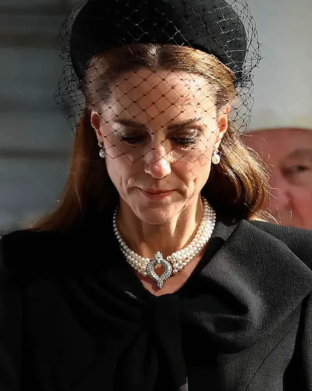 Kate, 43, chose her attire with meticulous care, selecting a pearl necklace and matching earrings that once belonged to Her Majesty.