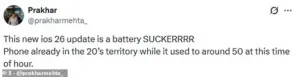 Multiple users have shared similar experiences, with one lamenting, ‘This new iOS 26 update is a battery SUCKERRRR.