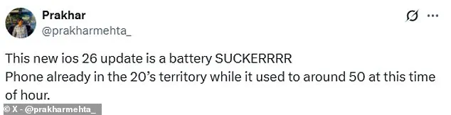 One user tweeted: ‘This new ios 26 update is a battery SUCKERRRR. Phone already in the 20’s territory while it used to around 50 at this time of hour’