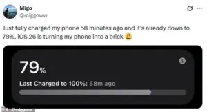 One user tweeted, ‘Just fully charged my phone 58 minutes ago and it’s already down to 79%. iOS 26 is turning my phone into a brick.’ Another added, ‘Dude wtf.