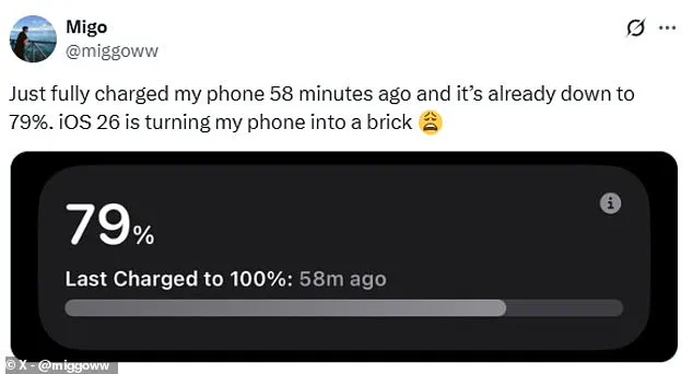 Taking to X, one said: ‘iOS26 is a battery hog! I typically don’t run out of juice and only need to recharge at night’
