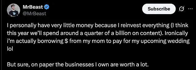 The YouTube star elaborated on his financial strategy, explaining that he reinvests nearly all of his earnings into his various ventures. ‘I think this year we’ll spend around a quarter of a billion on content,’ he wrote, highlighting the immense costs associated with maintaining his online empire.