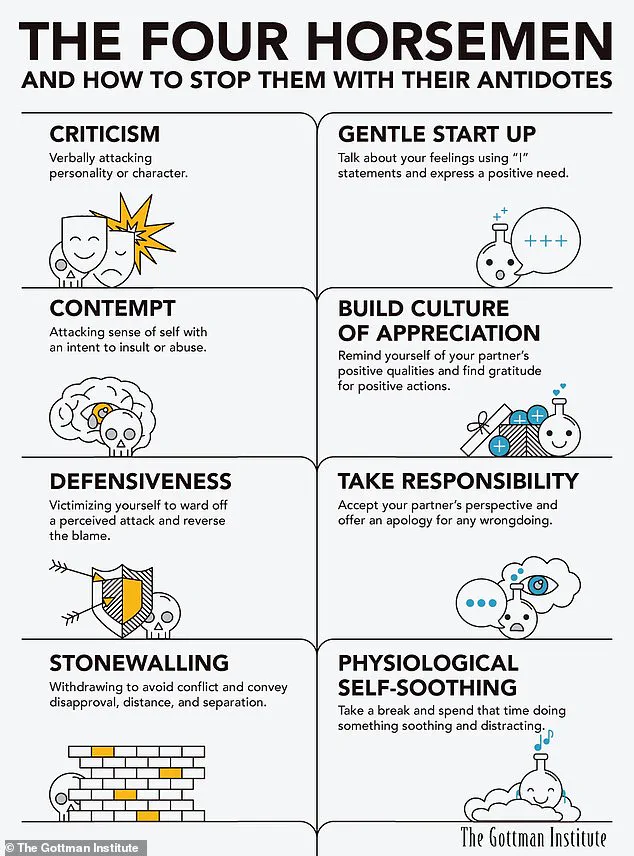 These patterns—criticism, contempt, defensiveness, and stonewalling—have been studied extensively and are considered critical indicators of marital instability. ‘Understanding these behaviors is the first step toward healing,’ says Dr.