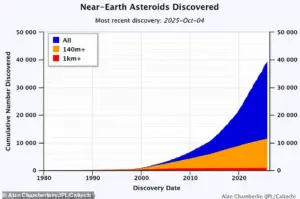 Among these, approximately 2,500 are classified as ‘potentially hazardous’ by the International Astronomical Union’s (IAU) Minor Planet Center, a designation reserved for objects whose orbits bring them close enough to Earth to warrant further study and monitoring.