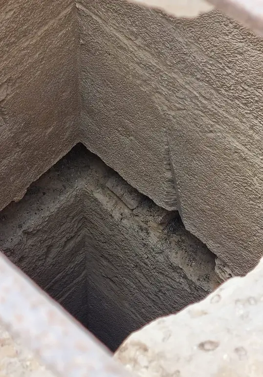 The first shaft, northeast of the Sphinx, has a square limestone mouth and plunges 130 feet—the height of a 12-story building. Its walls are precisely squared and lined with limestone and sandstone blocks, resembling the structure of some ancient machine