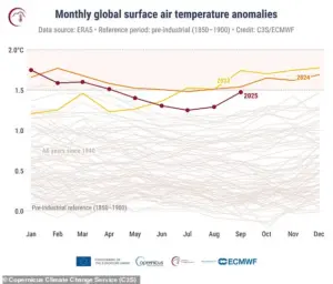 Samantha Burgess, deputy director of C3S, emphasized that the ‘global temperature context remains much the same’ one year on from the second-hottest September on record. ‘The global temperature in September 2025 was the third warmest on record, nearly as high as in September 2024, less than a tenth of a degree cooler,’ she said. ‘Persistently high land and sea surface temperatures reflect the continuing influence of greenhouse gas accumulation in the atmosphere.’