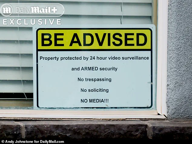 In one window, a sign has been placed banning media, soliciting, and trespassing, and warns visitors of armed security