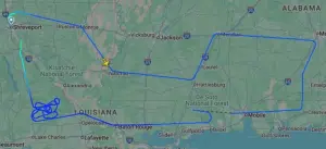 Flight data indicated the aircraft traveled east into Mississippi, circled near Baton Rouge, and returned to its base.