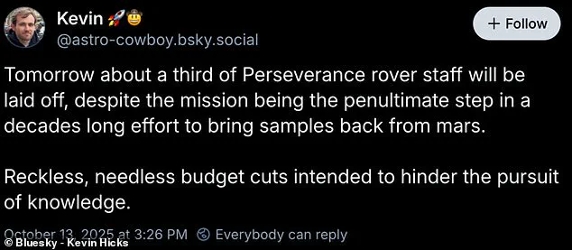 Kevin Hicks, a former rover operator, shared on Bluesky that ‘about a third of the Perseverance team has been laid off,’ a move that could jeopardize the mission’s ability to complete its critical role in bringing Martian samples back to Earth. ‘This is the penultimate step in a decades-long effort,’ Hicks wrote. ‘Cutting the team now is like dismantling a bridge just as the final planks are being laid.’ His comments have been echoed by others in the JPL community, who fear that the loss of expertise and morale will have lasting consequences for the agency’s ability to innovate.