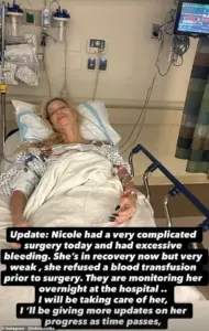 They are monitoring her overnight at the hospital.’ The posts have sparked concern among fans and medical professionals alike, with many questioning the implications of her decision to forgo a transfusion, a common practice in surgeries involving significant blood loss.