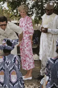 Another standout piece was a pink and white floral patterned dress she wore during a 1990 visit to Nigeria, an ensemble that blended elegance with cultural sensitivity.