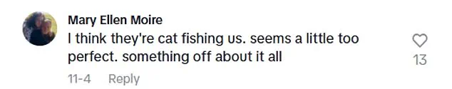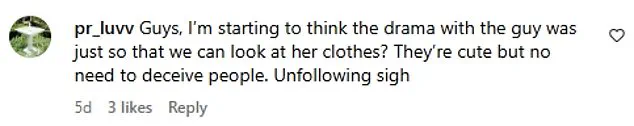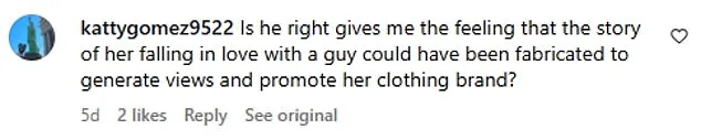Another commenter speculated, ‘I had a feeling that the story of her falling in love with a guy could have been fabricated to generate views and promote her clothing brand.’ This sentiment was echoed by a skeptical follower, who wrote, ‘I think they’re catfishing us.