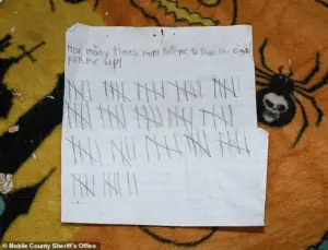 The letter, titled ‘How many times mom tells me that she can’t pick me up!’ was discovered amid a scene of unimaginable filth, where the girl had been living in a home littered with urine, feces, roaches, and trash.
