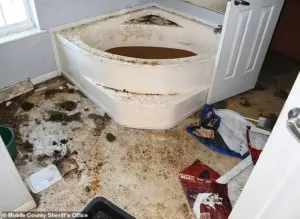 When investigators searched the mobile home, the conditions were described as ‘deplorable.’ Floors were coated in dirt, feces, and bugs, while a tub of dark brown water sat alongside debris and clothes strewn across every room.