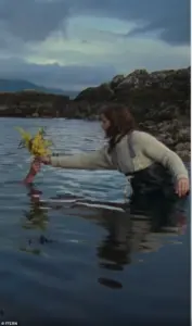 A pivotal scene in the advert sees Wilson wading into the sea to retrieve a bouquet of flowers from a mysterious hand that emerges from beneath the water’s surface.