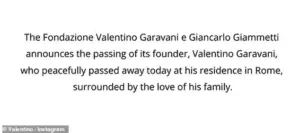 The news, confirmed exclusively by the Valentino Foundation through a somber post on Instagram, revealed that the legendary designer had died ‘peacefully at his residence in Rome, surrounded by his loved ones.’ The statement, carefully worded and devoid of unnecessary details, underscored the foundation’s role as the sole custodian of information about the final days of a man who had shaped global fashion for six decades.