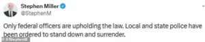 On Monday, Miller, a senior law enforcement official, issued a stark warning: ‘Only federal officers are upholding the law.