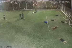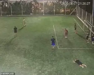 Footage captured by a nearby security camera reveals a scene of horror: five men, clad in full police uniforms and armed with assault rifles, stormed a football pitch at a golf club complex, their presence a stark contrast to the casual game of soccer being played by nine men.