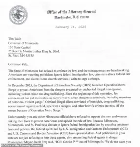 She also called for Minnesota’s detention facilities to ‘cooperate fully with ICE’ and for the Department of Justice to have access to the state’s voter rolls to ensure compliance with federal law. ‘I am confident that these simple steps will help bring back law and order to Minnesota and improve the lives of Americans,’ Bondi stated, framing her demands as a necessary measure to restore stability.