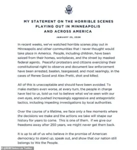 Only hours after Barack Obama released a statement on social media Sunday, Clinton weighed in on what he called ‘the horrible scenes playing out in Minneapolis and across America.’ His remarks focused heavily on the role of ‘masked federal agents’ in the violence, which he described as a direct affront to American values. ‘I never thought I would see such actions in America,’ Clinton wrote, referencing the use of excessive force against peaceful demonstrations and the militarization of law enforcement in urban centers.