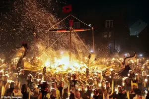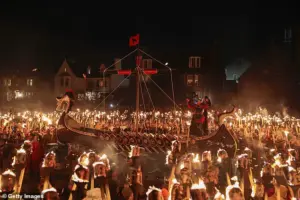 As dusk falls, the streets of Lerwick come alive with the flicker of 1,000 torches, each one a beacon of the festival’s ancient roots.
