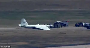 The incident, captured in dramatic footage from Ellington Airport, showed the research aircraft touching down before its belly scraped along the runway, sending sparks and flames trailing behind it.