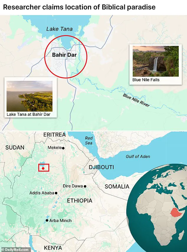 He interprets the biblical phrase ‘east of Eden’ as a reference to the direction in which the Blue Nile flows from the lake, a detail that aligns with the region’s topography.