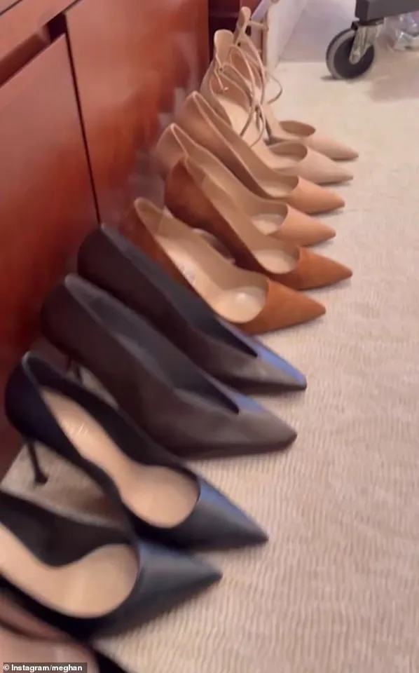 One shot captured an array of pointed-toe designer heels, color-coded and neatly arranged on the floor, while another revealed racks of expensive tops, leather bags, and neatly hung trousers—items not displayed in a high-end department store, but in the apartment where Meghan and Prince Harry were staying.